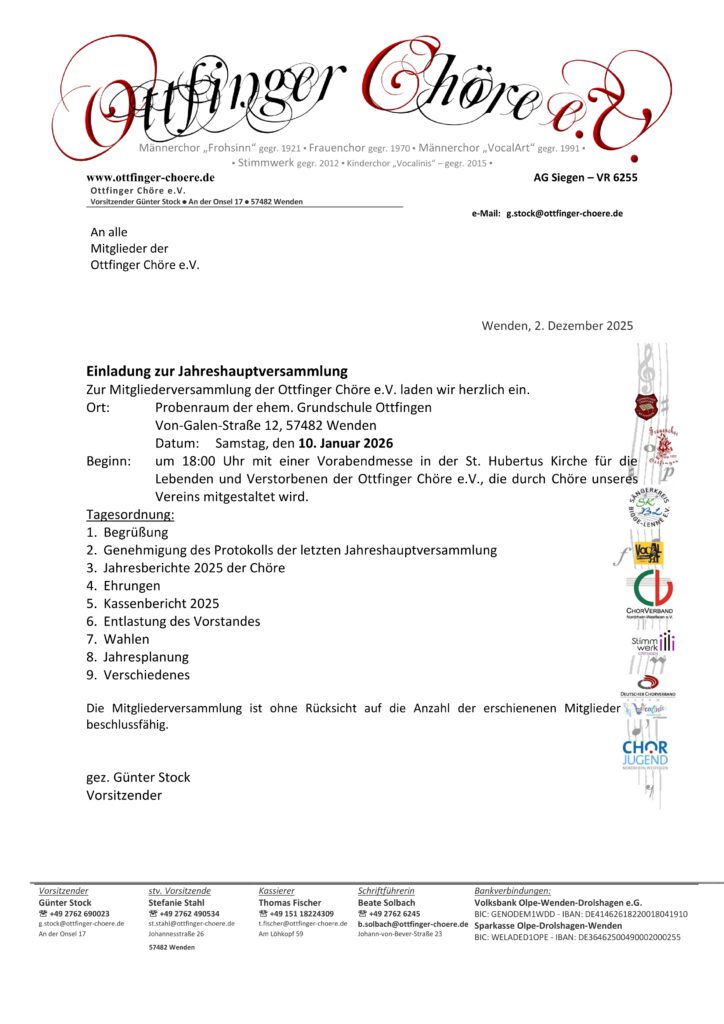 Herzliche Einladung an alle Mitglieder der Ottfinger Chöre e.V.