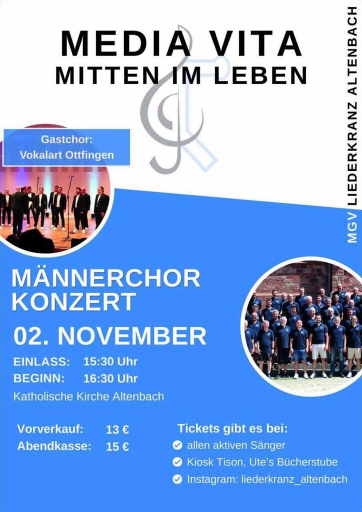 « Alle Veranstaltungen Vocal Art Media Vita – Mitten im Leben 2. November @ 16:30 – 19:00 Konzert mit dem MGV Liederkranz Altenbach Zum Kalender hinzufügen Google Kalender iCalendar Outlook 365 Outlook Live